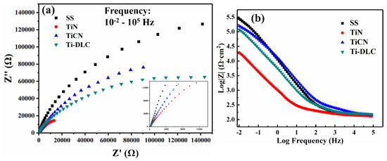 To evaluate the corrosion protection properties of the films, EIS measurements were carried out in artificial saliva at 37 °C. The Nyquist (including the locally amplified inner graphic) and Bode plots of the samples are shown in Figure 3a,b, respectively. The diameter of the capacitive loop in the Nyquist plots corresponds to the corrosion resistance. Figure 3a demonstrates that the corrosion resistances of the SS substrate, TiCN, Ti-DLC and TiN film decrease successively. The same order is found for the “log Z” values in Figure 3b. According to Zhang’s research, the impedance modulus at the lowest frequency (Zf = 0.01 Hz) is another parameter in the Bode plot for evaluating the corrosion protection capability of the films; a greater impedance suggests a better corrosion resistance [35].