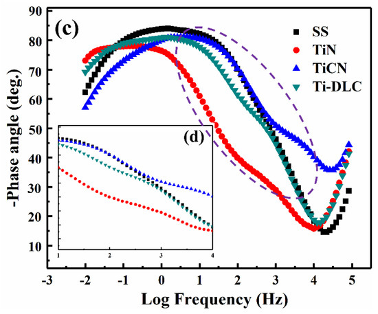 In addition, the “phase angle” of the Bode plot and the locally amplified graphic of 10–10k Hz are illustrated in Figure 3c,d. As shown in Figure 3c, the order of the sample corrosion resistance (Figure 3c) was consistent with the Nyquist plots, owing to the improvement of the passive film, that increased the phase angle [36]. Figure 3c and d show the 316L SS has only one plateau region and all the films have two; this indicates that the EC of the 316L SS has one time constant, but the three films have two.