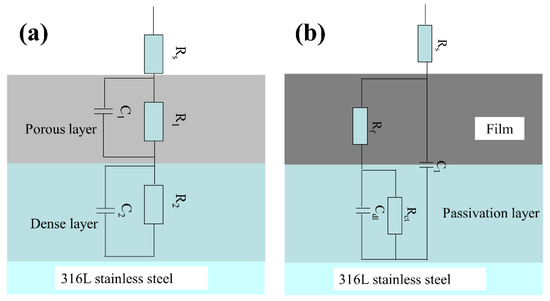 ECs of bare SS (a) and film-coated SS (b) used for fitting the impedance data.