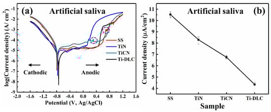 The Tafel polarization curves of the four samples immersed in artificial saliva are demonstrated in Figure 5a. A pronounced anodic peak emerged within the potential range from 0.592 to 0.618 V vs. Ag/AgCl and 0.185 to 0.223 V vs. Ag/AgCl, for 316L SS and TiN, respectively. The anodic peak was attributed to the film erosion in artificial saliva because the corrosive mediums can penetrate defects and microcracks of the film [40]. For Ti-DLC, it possessed a smooth anodic curve and a negative passive region, suggesting the less corrosion [26]. Normally, a low corrosion current density (Icorr) implies high corrosion-protection performance distinctly [37]. The Icorr was calculated using Tafel extrapolation and is summarized in Figure 5b. The Ti-DLC film possesses the lowest Icorr in artificial saliva, indicating the best corrosion resistance. This result is consistent with the polarization curve in Figure 5a. Its Icorr is considerably lower than that of the TiCN film, due to its ultrahigh thickness and that its surface clusters have already dissolved already. Wang et al. also reported an increase in electrochemical stability after the surface clusters dissolved [22]. They found that the TiCN coating with many clusters on the surface showed poor stability during the EIS test. With the dissolution of its surface clusters, a smoother surface was formed, leading to better corrosion resistance in subsequent potentiometric tests. The Icorr of Ti-DLC is higher than other similar DLC coatings, which may be due to the larger surface roughness (10.4 nm) than the others (approximately 4.2 nm) in this study. Other studies have shown large surface roughness weakens the corrosion resistance [28,31]. In addition to film thickness and roughness, the corrosion resistance may be affected by the degree of crystallization and grain size. These parameters can be controlled by the substrate temperature, deposition speed, external electric field, gas flow rate, and pressure. This could be the focus of a future study. The polarization curve for TiN shows a passive region in a narrower potential range and the highest Icorr, demonstrating the formation of an inferior stable passive layer compared with those of the other films.