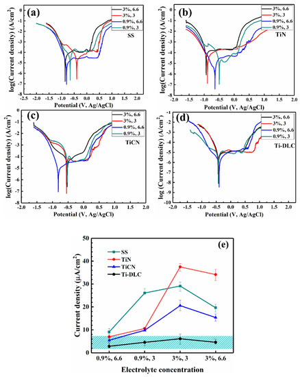Polarization plots and corrosion current densities of the four samples in different electrolytes. (a) Polarization plots of SS; (b) Polarization plots of TiN; (c) Polarization plots of TiCN; (d) Polarization plots of Ti-DLC; (e) corrosion current densities of the four samples.