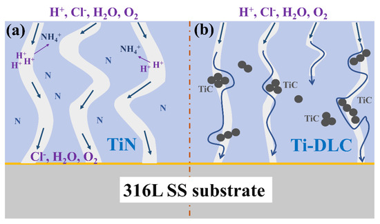 The electrochemical behaviors of the samples in different electrolyte systems were analyzed to evaluate the effects of the oral microenvironment on corrosion resistance, and the data are presented in Figure 6. The performance of 316L SS is different from that discussed in Section 3.3. The polarization curves of the 316L SS shift toward a more positive region with increases in the Cl− or H+ concentrations. In addition, its Icorr increased significantly, suggesting that the corrosion resistance of 316L SS was significantly affected by the changes in the electrolyte systems. This is because 316L SS contains corrosion-resistant elements, namely Cr and Ni, capable of forming a dense oxide film on the surface of the material [41]; thus, the best corrosion resistance was obtained from the EIS results. However, at high concentrations of Cl−, the Cl− were preferentially adsorbed onto 316L SS surface because of their affinity to metals. The locally adsorbed Cl− ions led to enhanced dissolution of the passive layer at these sites, thinning of the passive layer and eventually active dissolution. Further, the chemical activity of the H+ cations significantly accelerated this process [42]. Figure 5e shows, the TiN films are insensitive to changes in pH. However, as the concentration of Cl− increased from 0.9% to 3%, Icorr increased from 10.588 to 37.51 μA/cm2. According to Liu, during the dissolution of TiN, the H+ ions are neutralized by the N ions released from the TiN, transforming into NH4+ [43]. However, in a Cl−-rich atmosphere, the TiN could not prevent Cl− from penetrating the film completely because of its low thickness and imperfections. Once the corrosive ions penetrate the coating through these small channels, a galvanic effect is formed at the interface between the coating and substrate, which accelerates the corrosion rate because of the difference in composition. Thus, Icorr of TiN is considerably higher than that of the 316L SS substrate in the (3%, 3) electrolyte [44]. The protection mechanism of the TiN film is illustrated in Figure 7a.