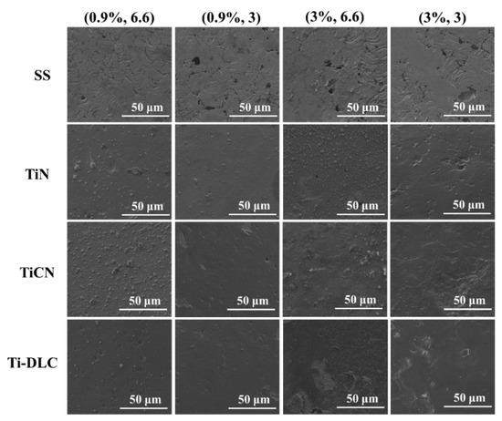 Our previous study [27] showed the as-prepared surfaces of 316L SS substrate was smooth, and the surface of TiN had some particles and pinholes. Moreover, TiCN and Ti-DLC had many nanocrystal clusters after physical vapor deposition (PVD). According to the XRD data, these clusters were the TiC which was generated by the reaction of Ti and C during deposition. Additionally, the thicknesses of the TiN, TiCN, and Ti-DLC films were 2.05, 4.10 and 4.48 μm, respectively. The Ti-DLC was found to exhibit the best adhesion and anti-wear properties.