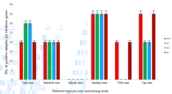 The OD 0.2 of sample 1 reported that these strains can strongly adhere to biotic and abiotic surfaces. Sample 2 producing an OD of 0.15 showed that these strains are also involved in biofilm production with moderate adhesion to the surfaces. Sample 3 with OD 0.1 showed that the strains were involved in weak adhesion to the surfaces with biofilm production as shown by []. In current research, virulence genes were detected in DEC isolates to detect the presence of virulent E. coli strains in drinking water. Other studies have also reported the presence E. coli strains as fecal indicator bacteria originating from defective hygiene and poor sanitation and animal fecal contact in freshwater places in developing countries [,,]. The presence of ETEC in drinking water is indicative of a high risk of contamination. In general, these results found that the risk of contamination may increase over time, and it is high time to follow appropriate preventive measures.