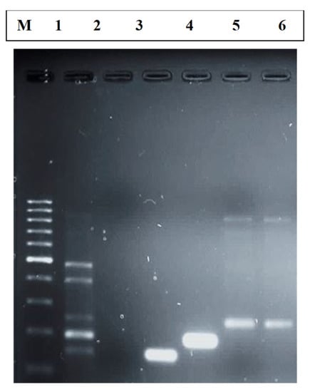 The boiling centrifugation method was used to extract DNA from all isolated E. coli colonies as described by [], with slight modifications. Isolated E. coli colonies were subcultured on nutrient agar at 37 °C. Isolated E. coli colonies were picked from a nutrient agar plate in a sterile Eppendorf tube and washed with 1 mL sterile normal saline (NS). It was centrifuged at 10,000 rev/min for 2 min. The pellet was recovered and re-suspended in 100 μL distilled water. Then, the tubes were boiled at 85 °C for 10 min. The lysate was centrifuged at 13,000 rev/min for 5 min. The supernatant containing template DNA stock was stored at 20 °C. The presence and concentration of extracted template DNA were measured by using agarose gel electrophoresis in the sample, and it was compared with a specific DNA marker of known concentration.