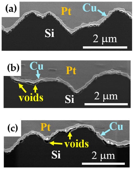 The cross-sectional views of SEM for the Cu/AZO/Si samples annealed at 400, 600, and 800 °C are shown in Figure 2. The copper thin films were continuous for all samples. However, the thin films (Cu/AZO or Cu) were detached from the substrate (silicon or AZO/Si substrate) in some areas for the samples after 400 °C annealing. It was hard to know the composition of the detached thin film (Cu/AZO or Cu) from FIB-SEM. Additionally, the separation of thin films and silicon substrate (or AZO/Si) became severe at temperatures of 600 and 800 °C. It was also hard to confirm the gap formed at the Cu and AZO/Si or Cu/AZO and silicon interfaces.