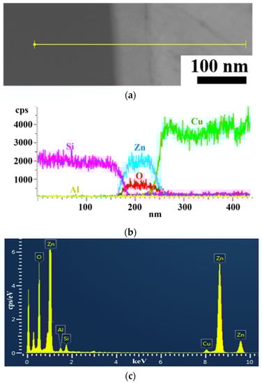 The low and high magnification TEM micrographs of Cu/AZO/Si sample annealed at 300 °C are shown in Figure 3a,b, respectively. The multilayer is preserved after annealing at 300 °C for 10 min. The structure of the as-deposited sample is the same as the sample annealing at 300 °C for 10 min. Figure 3c–f shows the EDS maps of Si, Cu, Zn, and O, respectively. The Zn and O elements are overlapped and located between the copper and silicon elements. The elemental maps reveal that the Cu/AZO/Si stack structure is very stable after annealing at 300 °C for 10 min. The line scan across the Cu/AZO/Si using STEM-EDS is shown in Figure 4a. Figure 4b shows the intensity signal of the Si, Zn, O, Al, and Cu elements along the yellow line, shown in Figure 4a. The signal of the aluminum element is almost at the noise level due to the small aluminum amount in the AZO layer. The spot analysis of the AZO layer is shown in Figure 4c. The amount of aluminum is only about 1.3 at.%. The distribution of zinc and oxygen in the Cu/AZO/Si stack is located at a scale between 180 and 245 nm, which reveals that the thickness of the AZO layer is near 65 nm. There were interfacial layers at the scale of 165–190 nm and 235–260 nm (Figure 4b). The width of the interface layer was caused by the situation where the interface plane was not perpendicular to the figure shown in Figure 4a. The thickness of the AZO thin film is also near 65 nm, from Figure 3b–f. The thickness of the copper thin film is about 220 nm, as shown in Figure 3b,d. Only a silicon signal emerges at a scale below 160 nm. Additionally, the copper signal was presented at a scale almost greater than 260 nm. The line scan shows that Cu/AZO/Si structure is maintained after annealing at 300 °C. The result of the line scan (Figure 4) agrees with the work of the TEM and EDS map (Figure 3).