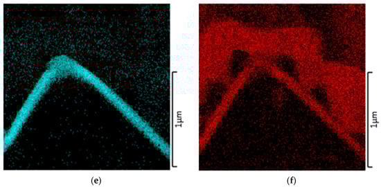 For the annealing of the samples at temperatures of 500, 600, and 700 °C, STEM images also confirm that the copper thin film detached from AZO/Si in the valley of the textured silicon substrate after annealing. Additionally, the gap between the copper and AZO layers increases as temperature increases. For the sample annealed at 800 °C, the TEM and STEM micrographs of Cu/AZO/Si are presented in Figure 5a,b, respectively. Additionally, the EDS map of Si, Cu, Zn, and O is illustrated in Figure 5c–f, respectively. The copper layer starts to agglomerate and almost leaves the textured structure’s valley area from Figure 5. The AZO layer seems stable even after annealing at 800 °C, and the copper element stays above the AZO layer. The copper layer also presents the oxygen signal from Figure 3f and Figure 5f. The origin of oxygen migration to the copper layer needs further identification. The STEM-EDS evidence that copper does not diffuse through the AZO layer to the silicon substrate. Therefore, the AZO thin film is also an excellent diffusion barrier layer to prevent copper diffuse into the silicon substrate.