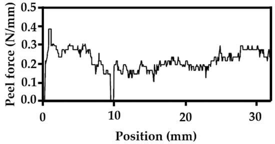 To understand the formation of the gap at the copper and AZO/Si interface, the tape and peel-off tests were used to evaluate copper’s adhesion on the AZO/Si substrate. About 15 µm thick copper layer deposited on the as-deposited Cu/AZO/Si by electroplating for tape and peel-off tests. The sample is designed as E-Cu/Cu/AZO/Si. No copper remained on the AZO/Si after the 180° tape test. Figure 6 shows the peel force diagram for the E-Cu/Cu/AZO/Si sample. The maximum and average peel force values were 0.39 and 0.2 N/mm, respectively. The results indicated that the adhesion between copper and AZO/Si is weak. It can imply that the adhesion strength will decrease as annealed temperature increases due to the voids emerging when the temperature is higher than 400 °C. Lee also reported a copper seed layer deposited on an indium tin oxide (ITO) by electron-beam evaporation []. After the copper seed layers were deposited, copper/silver (Cu/Ag) metal stacks were plated on the sample using the light-induced plating (LIP) technique. Additionally, adhesive contact between copper and ITO was evaluated by the tape test []. The results show that pure copper was mostly detached from the ITO surface after the tape test. Their results also indicated that the adhesive force between copper and ITO/Si is very weak. Kang deposited the (Ti(30 nm)/Cu(100 nm)) on p-type (1 0 0) Si as a seed layer. Then thick copper was electroplated on the seed layer []. They found that rapid thermal annealing (RTA) caused the electroplated films to fail to adhere to the Si. The adhesion strength of copper and ITO or Si was deficient from Lee’s and Kang’s reports. Our result shows that the adhesion between copper and AZO/Si is very weak, from the tape test. Additionally, the gap formed at the copper and AZO/Si interface easily after high-temperature annealing. It can imply that the copper detached from the AZO/textured silicon after annealing due to the weak adhesion of copper thin films on the AZO/Si. Additionally, the separation of copper and AZO/Si became serious at high-temperature treatments.