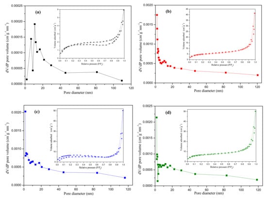 Pore diameter as a function of pore volume of (a) PVC, (b) MWCNTs-20, (c) MWCNTs-25, and (d) MWCNTs-28 membranes. The insets showed the nitrogen adsorption–desorption isotherms.