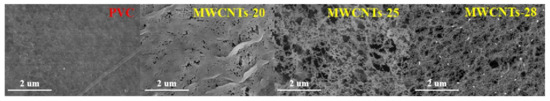 Surface SEM images of PVC, MWCNTs-20, MWCNTs-25, and MWCNTs-28 membranes.
