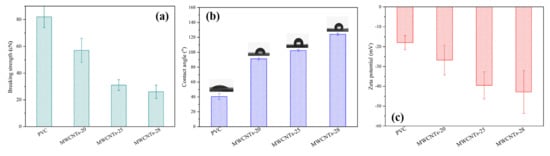Breaking strength (23 cm × 16 cm area) (a), contact angle (b), and zeta potential (c) of PVC, MWCNTs-20, MWCNTs-25, and MWCNTs-28 membranes.