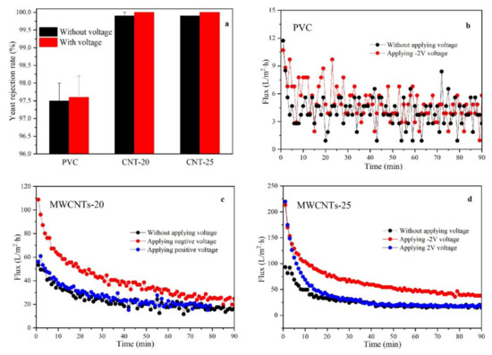 The MWCNTs/PVC conductive membranes were used to filtrate the 3 g/L yeast solutions. The experiments included five parallel tests for each membrane either without or with an external electric field. As shown in Figure 9a, the yeast rejection of the PVC membrane was 97.5% and 97.6% without and with the electrical field, respectively; those of the MWCNTs-20 and MWCNTs-25 membranes were over 99.8% no matter whether the electrical field was applied or not, with the standard deviation lower than 0.2%. The electrical field had negligible influence on the membrane rejection towards yeast, suggesting that the molecular size of the yeast was larger than the pore size of the prepared membranes. The noticeable increment in the membrane yeast rejection after incorporating the MWCNTs was due to a more uniform pore structure being formed. The diameter of the nanotubes was uniform, and the skeleton formed by the MWCNTs was stable; thus, the overall membrane rejection further increased.