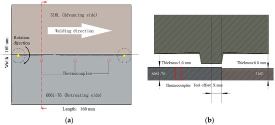 Figure 1a illustrates a schematic diagram of the welding experiment, and X is the tool offset in Figure 1b. As a result of the differences in physical properties between Al and Fe alloys, the Al alloy is placed on the retreating side (RS) to allow its strong plasticity to form a satisfactory weld [8]. In this study, a 1.0 mm-thick 6061-T6 Al alloy and a 0.8 mm-thick 316L SS were used. Table 1 shows the chemical composition of the metal as given in the material certificate provided by the supplier.