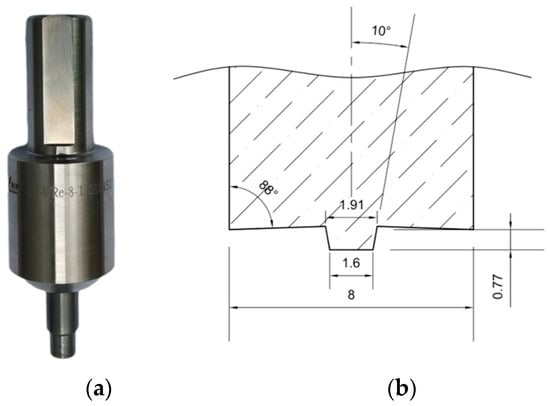 An example of an FSW tool. (a) Physical drawing of the tool; (b) specific dimensions of the tool (unit: mm).