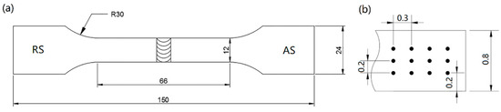 Tensile test and hardness test: (a) specific dimensions of the tensile specimen; (b) schematic diagram of the hardness measurement location (unit: mm).
