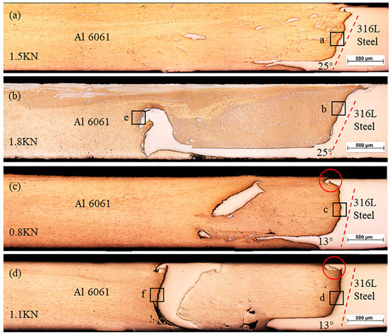 Under the HRS parameters, the welding speed was slow, and the axial force was large. Consequently, the heat generation increased, and the middle part of the SS welding interface changed to a plastic state. Therefore, the local aluminum alloy was brought to the SS side and, at the Al-Fe interface, a 25° inclination angle was formed. However, under the ultra-HRS parameters, the inclination angle of the Al-Fe interface was reduced to 13°, and at the Al-Fe interface, part of the SS flowed to the aluminum alloy. This is shown in the red-circled areas of Figure 4c,d. The plastic material in the affected area of the shoulder tended to squeeze up at the tool pin because of the inclination angle of the tool shoulder. According to the Bernoulli effect, when rotation speed and welding speed increase, the linear speed of the material in the interface area reaches 306.7 mm/s, resulting in a drop in the interface pressure. The SS on the upper surface of the weld was in a plastic state under the higher rotation speed, and the plastic SS was pressed to the aluminum side. Conversely, as the welding speed increased, the welding heat input and the centrifugal force on the plate reduced, enabling the Bernoulli effect to occupy a dominant position and the inclination angle to decrease.