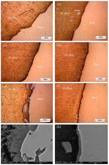 Figure 5 shows enlarged maps of the Al-Fe interface, corresponding to the boxes marked with black rectangles in Figure 4, and Figure 5a–d shows details of the Al-Fe interface. The steel particles on the aluminum alloy side are smashed more finely with the increase of rotational speed. In Figure 5b,d, when a small offset on the Al side was used, it is clearly observed that some small areas with gray contrast were distributed uniformly in the nugget zone. This is consistent with the phenomenon reported by X. Liu et al. [8,32] In addition, it shows that the smaller the offset, the more diffuse the distribution. On the RS near the aluminum alloy, the light gray contrast area in Figure 5e is IMC, and the corresponding SEM diagram in Figure shows that the thickness of IMC is uneven and is higher than 7 μm in Figure 5g,h.
