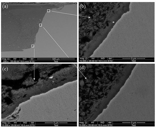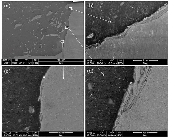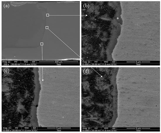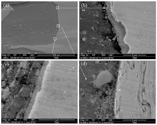 SEM image of the HRS-FSW interface and the EDS measuring position under a high tool offset. (a) Low- magnification SEM picture, (b) SEM Al-Fe interface picture at the top and EDS point scan position, (c) SEM Al-Fe interface picture in the middle, and (d) SEM Al-Fe interface picture at the bottom.
