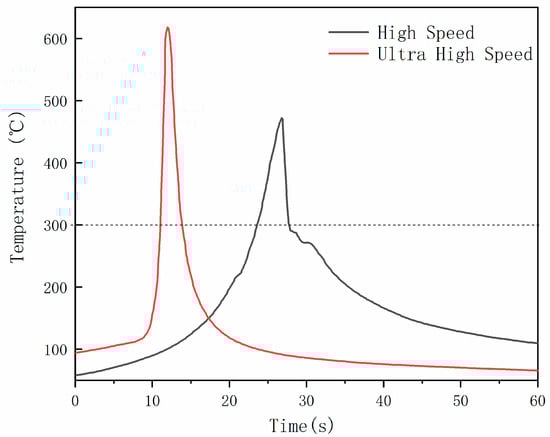 The key influencing factors that contribute to the formation of IMC in the welding of Al-Fe dissimilar metals are heat input and axial pressure [4,33]. Therefore, it is necessary to measure the temperature of the welding process. When using different offsets, there are slight temperature differences. Figure 10 shows the temperature measurement data for the HRS and ultra-HRS parameters. The highest temperatures measured by the HRS and ultra-HRS connection methods were 470 °C and 620 °C, respectively. The highest temperature was lower than 655 °C, the Al-Fe eutectic point. In the paper by Mahoney [34], it was found that the temperature difference along the direction of thickness was almost negligible. Since a thinner thickness was used in this experiment, the temperature can be considered to be the same in the direction of the thickness. The experimental temperature measurement point was close to the thermal mechanically affected zone on the RS. Therefore, in the welding process, the measured temperature at this point could be considered closest to the highest temperature.