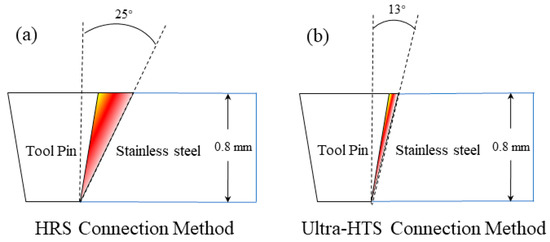 Micro friction stir welding (µ-FSW) refers to FSW with a thickness of less than 1 mm. For thin plates, micro friction stir welding presents a feasible connection method between Al alloy and SS. Chen et al. [21,22,23] pointed out that high rotation-speed FSW can improve the degree of material mixing, with less material thinning, and can reduce the machine rigidity needed. The HRS-FSW (High rotation speed-FSW) is higher than 2000 rpm and lower than 15,000 rpm, which can realize μ-FSW connection. The FSW connection can be made with a lower axial force. This reduces the rigidity requirement of the machine, which is beneficial in the case of welding robot applications.