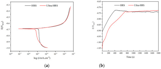 The Al-Fe alloy FSW joint showed more IMC with two parameters of HRS and ultra-HRS under a smaller tool offset. Figure 12a shows the time-dependent curve of an open-circuit potential (OCP) in a 3.5 wt% solution. From Figure 12a, it can be seen that with the increase in immersion time, the corrosion potential (Ecorr) of the two samples moved to a positive potential, indicating that the two materials spontaneously formed a passivation film [37]. At around 800 s, the Ecorr for the HRS sample reached a stable potential of −0.74 VSCE from about −0.91 VSCE to a higher potential. However, the Ecorr of the ultra-HRS sample remained stable at −0.73 VSCE at about 700 s. In comparison with the HRS sample, the ultra-HRS sample took less time to obtain the steady potential in a 3.5 wt% NaCl solution. The Ecorr value was corrected, indicating that the Ultra-HRS sample was more corrosion-resistant [38,39,40]. The IMC were the main factor affecting the corrosion resistance since the corrosion interface was composed of IMC from the SS matrix and the aluminum alloy matrix.