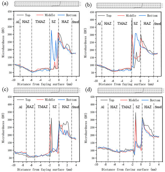 This figure corresponds to the microhardness values of the connector of (a) serial number 1, (b) serial number 2, (c) serial number 3, (d) and serial number 4 in the parameters of Table 2.