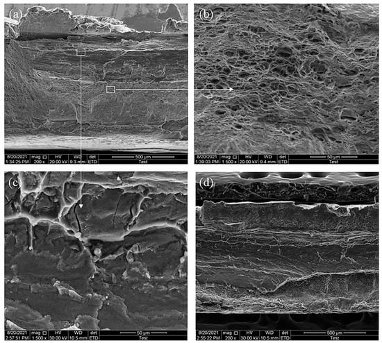 SEM photos of tensile fracture (a) fracture SEM picture under HRS-FSW. (b) partial enlargement in (a). (c) partial enlargement in (a). (d) fracture SEM picture under ultra-HRS-FSW.