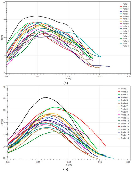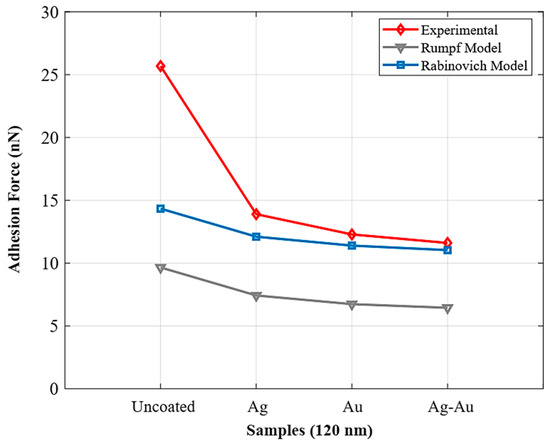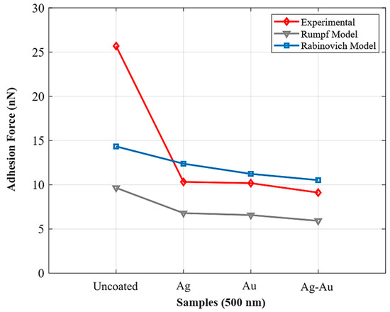 - Comparing all coated samples with the non-coated ones suggests that reducing the adhesion force in all coated specimens is due to the reduction of surface energy and increased surface roughness. The surface energy of the gold on a silicon substrate is 1 J/mm2, and this value for silver on the silicon is 1.25 J/m2 [42,43]. According to the results, the highest roughness is related to the gold surface, which is an effective parameter in reducing adhesion due to the reduction of the contact surface [44,45]. In addition, the surface energy of gold is less than that of silver, which is a reason for the impact of surface energy on adhesion.