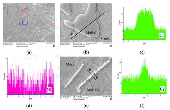The as-cast microstructure and EDS analyses of boron-bearing stainless steel: (a) the microstructure morphology of as-cast boron-bearing stainless steel; (b) displaying microstructure morphology of A area: C-borocarbide [M2(B,C)], E-matrix; (c,d) displaying the distributions of chromium and nickel elements along black line in (b), respectively; (e) displaying the morphology of B area: D-borocarbide [M7(B,C)3], E-matrix; (f,g) displaying the distributions of chromium and nickel elements along black line in (e), respectively.