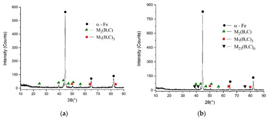 X-ray diffraction spectrums of as-cast (a) and heat-treated, (b) boron-bearing stainless steel.