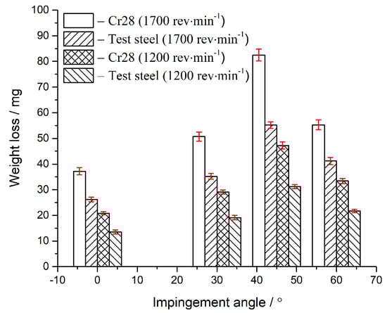 In the slurry, an erosion–corrosion tester (Xiangyu Machinery Processing Co. Ltd., Xi’an, China) was used to investigate the erosion–corrosion performance of boron-bearing stainless steel. In present research, the contrast material was Cr28 white cast iron (2.48C-27.82Cr-2.32Mo, wt.%, 60.8 ± 0.7 HRC). The physical design of the erosion–corrosion testing machine is shown in Figure 2. The geometric sizes of the erosion–corrosion testing sample B (as shown in Figure 1a) are shown in Figure 1b. The erosion–corrosion face on sample B was polished for the erosion–corrosion experiment. The revolving speeds (rev·min−1) of mixing wheel (as shown in Figure 2) were selected at 1200 and 1700, respectively. The distance L (in Figure 2) between mixing wheel center and erosion–corrosion sample B was set to 80 mm. The mixture containing 8000 mL, 2.4% sulfuric acid solution and 3 kg quartz sand (SiO2, 900–1100 HV [32], the size was 0.61 ± 0.13 mm) was used as the erosion–corrosion slurry, and the percentage of sulfuric acid in the slurry was 1.7%. Based on the cooling water, the temperature in the slurry was limited to 20 ± 1 °C in the test process. The impingement angles (as shown in Figure 2) containing 0°, 30°, 45° and 60° were designed for erosion–corrosion samples. The test time of erosion–corrosion experiment was 180 min. The electronic balance (the accuracy was 0.1 mg) was chosen to analyze the erosion–corrosion weight loss in the sample. The weight loss average of three samples was regarded as the experiment result.