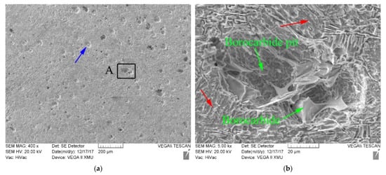 When the impingement angle is set to 45° and the rotating speed is set to 1200 rev·min−1, many pits (the position of the blue arrow in Figure 7a) and scraping traces (the position of the red arrow in Figure 7b) exist in the erosion–corrosion face of boron-bearing stainless steel samples. When the face of the sample is eroded and corroded by slurry, the scraping of SiO2 particles causes the scrape trace to appear in ferrite matrix. The erosion and corrosion damages of the matrix make the borocarbide exposed. The impact of SiO2 particles can break the exposed borocarbide and cause pits (Figure 7b) to appear on the erosion–corrosion face.