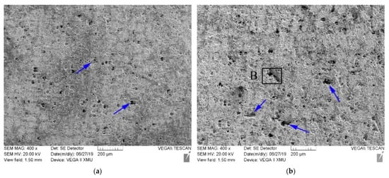 For Cr28 white cast iron and boron-bearing stainless steel, the mixing wheel with a higher rotating speed leads to a higher erosion–corrosion weight loss (as shown in Figure 6). For boron-bearing stainless steel, compared with Figure 7a (blue arrow), the characteristics of the borocarbide pit in Figure 8b (blue arrows) are larger and more numerous. This phenomenon has a positive relationship with Figure 6. The reason for this is that the impact velocity of the slurry is increased by the mixing wheel possessing a higher rotating speed. The damages to the matrix and borocarbide can be exacerbated by the slurry with a higher impact velocity, which makes the erosion–corrosion weight loss become higher.