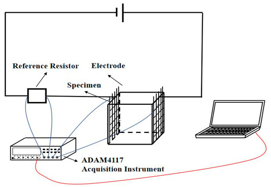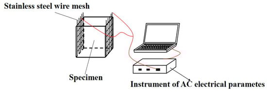 The cement and waste fly ash were mixed in the NJ-160A cement paste mixer offered by Wuxi Jian Ding Jian Gong Instrument Factory, Wuxi, China, and stirred at a speed of 140 rpm for 1 min. After this mixing, the uniformly mixed mixture of water and water reducing agent were added to the raw materials and stirred at the speed of 140 rpm for another 1 min. After the mixing was finished, two minutes of stirring with the speed of 285 rpm were provided. After the mixing was finished, a steel cone with a bottom diameter of 60 mm, a top diameter of 36 mm, and a height of 60 mm was applied in the determination of the slump flow of the prepared fresh paste. Moreover, the plastic viscosity of the paste was determined by the NXS-11B rotating viscometer manufactured by Chengdu Leadership Instruments Co., Ltd., Chengdu, China, with the shear rate of 8 rpm. Then, the remaining cement paste was poured to form the specimens with sizes of 50 mm × 50 mm × 50 mm and 40 mm × 40 mm × 160 mm. Specimens with sizes of 50 mm × 50 mm × 50 mm and 40 mm × 40 mm × 160 mm were used for the determination of electrical parameters and mechanical strengths, respectively. The two-electrodes were offered to electrify for the measurement of electrical parameters. The size of electrodes was 45 mm × 65 mm made by 4 mesh 304 stainless steel meshes. The space between the electrodes was 40 mm. The AC electrical resistance was determined by AC resistance testing instrument named TH2810D LCR digital electric bridge produced by Changzhou Tonghui Co., Ltd., Changzhou, China. The AC power frequency of TH2810D LCR digital electric bridge was 10,000 Hz with the testing AC voltage, and the sampling frequencies of AC electrical resistance measurements were 1 V and 1 Hz. The measurement of AC electrical resistance is shown in Figure 1. The compressive and flexural strengths of specimens were tested by the YAW-300 microcomputer full-automatic universal with the loading speed of 0.05 kN for the determination of flexural strength and the loading speed of 2.4 kN for the measurement of compressive strength. The measurement of mechanical strengths was carried out according to GB/T 17671-1999 Chinese standard [20]. The DC power with the maximum voltage of 1 V was provided for the measurement of electrical resistance time history curves. The DC voltage was collected by ADAM 4117 acquisition instrument provided by Nanning Yanhua Electronic Technology Co., Ltd., Nanning, China. The electrical signals were collected per second. The electrical resistance time history curves were determined by reference resistance method. This method can be described as follows: