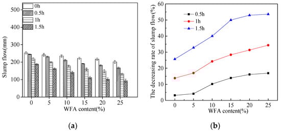The slump flow of fresh cement paste with different dosages of waste fly ash. (a) The slump flow of fresh paste, (b) the decreasing rate of slump flow.