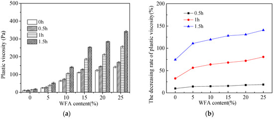 The plastic viscosity of fresh cement paste with different dosages of waste fly ash. (a) The plastic viscosity of fresh paste, (b) the decreasing rate of plastic viscosity.