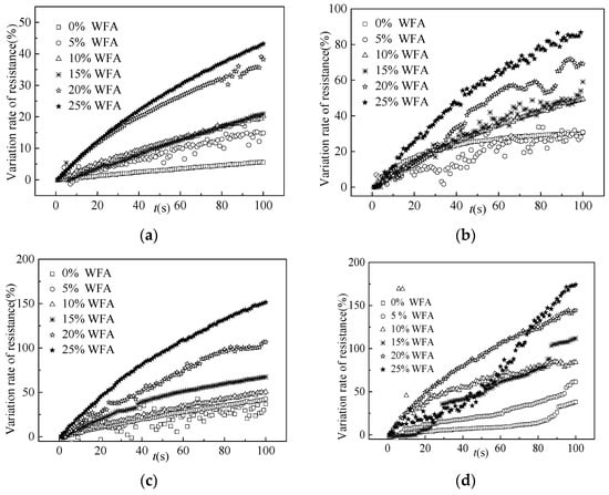 Figure 6 shows the variation rate of DC electrical resistance of cement paste cured for 1 d, 3 d, 7 d, and 28 d. It can be obtained from Figure 6 that the DC electrical resistance increased with the increasing testing time due to the electric polarization, thus resulting in the electrical resistance increasing with the conducting time [27]. Moreover, the addition of waste fly ash and the increasing curing time demonstrated the increasing roles in the variation rate of DC electrical resistance.