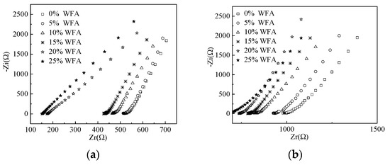 Figure 7 shows electrochemical impedance spectroscopy curves of specimens cured for 1 d and 28 d. The extreme points of all curves decreased with the increasing dosages of waste fly ash, indicating that the addition of waste fly ash could improve the electrical conduction and lead to decreasing the electrical resistance of specimens due to the increased conductive particles by the metallic elements, thus improving the electrical conductivity and decreasing the electrical resistance. Moreover, the extreme points of all curves increased with the increased curing ages due to the improved hydration degree, thus decreasing the free ions and the electrical resistance [28,29].