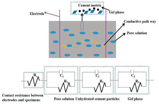 Figure 8 shows the equivalent circuit diagram of specimens. The circular section can be represented by the parallel of resistance and capacitance elements. The initial resistance (Rs) corresponds to the contact resistance between specimen and electrodes. Then, the following series of connected electrical components represented the shunt-wound resistance (R1) and electrical capacitance (C1) of the pore solution. A conductive pathway was formed by the pore solution in the cement matrix. The Chi-squared of the equivalent circuit diagram was less than or equal to 1.451 × 10−4, ensuring the validity of the equivalent circuits.