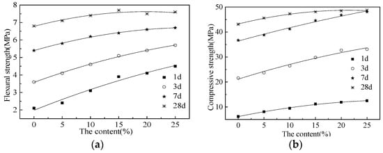 The increasing rate of mechanical strengths: (a) The increasing rate of flexural strength; (b) The increasing rate of compressive strength.
