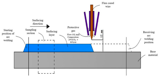 The experiment used H13 steel plate with a size of 50 mm × 40 mm × 8 mm as the base material, and 1.2 mm H13 flux-cored wire as the welding wire for surfacing repair. The surfacing parameters are shown in Table 1, and the alloy compositions of base metal and welding wire are shown in Table 2 and Table 3.