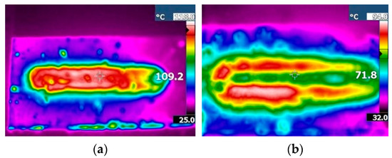 Figure 2 is a thermal image of the single-pass single-layer surfacing process on the substrate. It exhibits that the temperature in the surfacing area is the highest, and the temperature has a decreasing trend to the surrounding substrate. When cooled for 80 s, the temperature of the substrate on both sides of the surfacing layer is higher than that of the surfacing zone. This experimental phenomenon is basically consistent with the numerical simulation of Ying et al. [16] and Cho et al. [17], that is, the temperature in the welding zone is the highest and the surrounding temperature decreases in turn. The reason is that the heat transfer diffuses from the high temperature zone to the low temperature zone [18]. When the heat energy of the surfacing layer diffuses to the substrate, a new high temperature zone will be formed, and the temperature of the surfacing zone will drop sharply through heat transfer and heat exchange with air, thus the temperature of both sides of the surfacing layer in Figure 2b is higher than that of the surfacing zone.