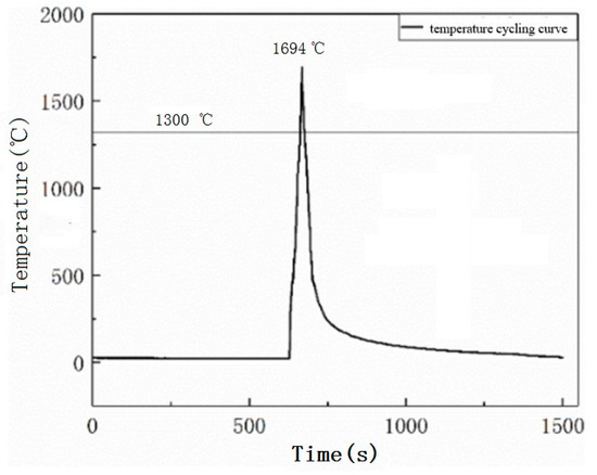 As shown in Figure 3, the thermal cycling curve at the midpoint of the centerline of the single-pass single-layer surfacing obtained from the experiment. The figure shows that the temperature of surfacing heat source reaches 1694 °C, higher than the melting point of H13 steel; the heating rate and cooling rate of surfacing layer are almost the same, but when the temperature reaches 300 °C, the cooling rate of surfacing layer decreases obviously.