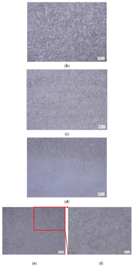 - In the bonding zone shown in Figure 5d, the formed structure is mainly martensite, and there are also some carbides at the edges of the white ferrite grains; the bonding zone is located between the surfacing layer and the base metal, which is the transition zone, where the quality of the structure is generally poor. This is because the temperature of the bonding zone during the surfacing process is higher than the solidus line but lower than the liquidus line. The metal is in a molten state at this time. The uneven distribution of chemical composition in base metal and welding wire leads to the uneven distribution of microstructure, which makes the microstructure and properties of bonding area much worse than other areas; the existence of the bonding zone further indicates that there is atomic diffusion and migration between the surfacing layer and the base metal, and the liquid metal of the surfacing layer interacts with the solid base metal, resulting in metallurgical bonding. The main chemical elements C, Cr, Mo and V of H13 steel plate and H13 steel flux cored wire are the same, so the fusion among them is better. The bonding zone is mainly formed by the infiltration of carbon and alloy elements, and the diffusion speed is determined by the element concentration gradient, temperature, time and atomic mobility. Because the cooling rate of MAG surfacing process is very fast, the contact time between liquid phase and base metal solid phase is very short, which finally leads to the short diffusion time of elements and the narrow bonding zone.