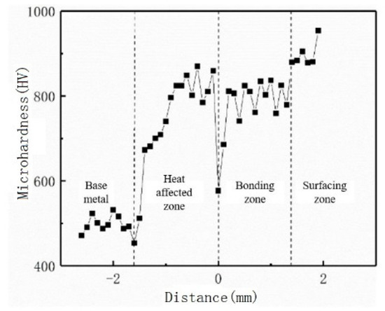 Combined with the analysis of the microstructure, it can be seen from Figure 6 that the surfacing area is mainly martensite with higher hardness. There are poor hardness points in the bonding area mainly because the cold and heat effects in this area are not obvious, and the surfacing layer and the base metal have given a buffer effect. The hardness gradually decreases from the heat-affected zone to the base metal. The base metal area is less affected by heat, its hardness value is basically stable, and the main structure is tempered martensite.