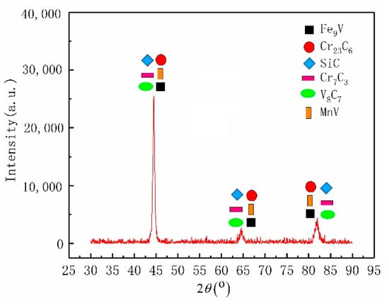 In order to investigate the effect of the phase composition on the quality of the surfacing layer, the phase composition of the surfacing layer was analyzed by XRD (X-ray diffraction). Due to the extremely fast heating and cooling rates of the MAG surfacing process, the phase of the surfacing layer after surfacing is often in a non-equilibrium state, which intensifies the difficulty of phase analysis of the surfacing layer. At the same time, the alloy elements in H13 steel flux cored wire often have complex physical metallurgical reaction in the surfacing process, and the phase is very complex, which also increases the difficulty of analysis. According to the XRD pattern of surfacing layer as shown in Figure 7, the main phases of surfacing layer are as follows: (1) chromium based solid solution (Cr, Fe), as the basic phase, mainly supports the surfacing layer. The diffraction peak consists the standard peak in the phase analysis, which indicates that the chromium based solid solution does not produce lattice distortion due to the addition of other metal elements in the surfacing process; (2) Cr carbides include M23C6, M7C3, Fe9V, V8C7, and a small amount of SiC and MnV; (3) intermetallic compounds.