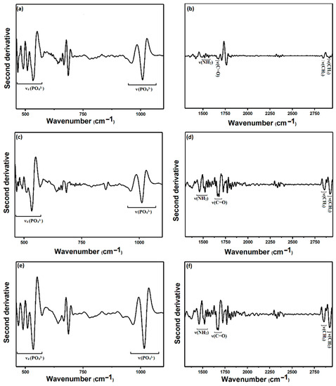Second derivative spectra of CS–HAp coatings obtained at: p = 2 × 10−3 mbar (a,b); p = 5 × 10−3 mbar (c,d); p = 1.2 × 10−2 mbar (e,f).