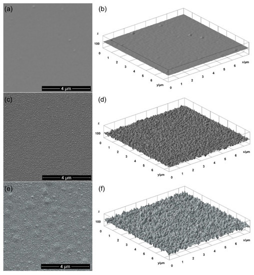Scanning electron microscopy (SEM) was used in order to study the influence of Ar gas working pressures on the surface morphology of CS–HAp coatings. The 2D SEM micrographs specific to the obtained CS–HAp coatings, along with their 3D representation, are presented in Figure 3. In the case of the CS–HAp coatings obtained at an Ar gas working pressure of p = 2 × 10−3 mbar, there could be noticed a smooth surface which showed a uniform growth (Figure 3a). Moreover, as the working gas pressure increased, it was observed that the surface of the coatings became more nanostructured, becoming granular. Therefore, at high pressures (p = 1.2 × 10−2 mbar), the surface morphology of the coatings is granular (Figure 3e). According to previous studies, these variations in the surface morphology of the coatings may be due to the polymerization process [24]. The 3D reconstruction of SEM images revealed the increase of granular structure with the increase of Ar gas working pressure (Figure 3b,d,f). Moreover, SEM micrographs do not show the presence of fractures, cracks, or other discontinuities on the surface of the analyzed samples.