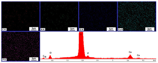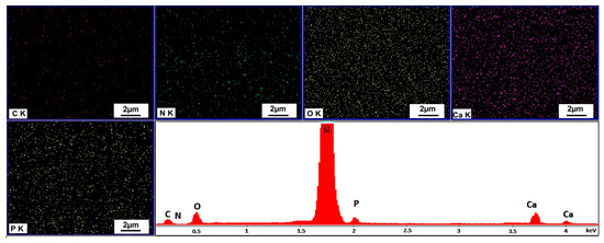 The chemical composition of CS–HAp coatings was investigated by EDX studies. Also, elemental mapping of the coatings’ surfaces was recorded. The results of EDX studies along with the specific elemental mapping are revealed in Figure 4, Figure 5 and Figure 6. In all the studied samples in the obtained EDX spectra, the following main chemical elements are present: carbon, nitrogen, oxygen, phosphorous, and calcium. All these elements are characteristic of the CS–HAp coatings. The Si line from the EDX spectra is produced by the substrate on which the coatings were deposited. On the other hand, the elemental mapping revealed the uniform and homogeneous distribution of Ca, P, O, N, and C on the samples. Furthermore, no additional chemical elements could be noticed in the EDX spectra, which suggests purity of the analyzed samples. It could be observed that the Ar gas working pressure slightly influenced the chemical composition of the analyzed samples.